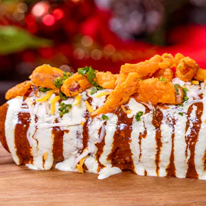 Classic Corn Dog topped with Spicy Chili, Jalapeño-Cilantro Crema, Cheddar Cheese and Crispy Onions, served with choice of Cuties® Mandarin Orange or Potato Chips