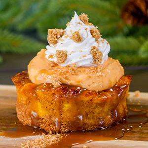 with a Graham Cracker Crust, topped with Pumpkin Cheesecake Filling, Whipped Cream, Graham Cracker Crumble and an Espresso-Brown Sugar Sauce