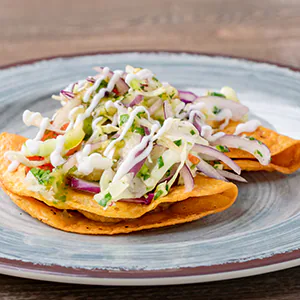 crispy Potato Tacos topped with Cabbage Slaw, Dairy-free Crema and Tomatillo Salsa