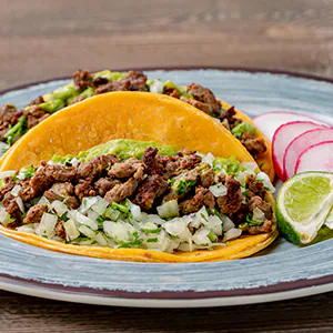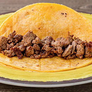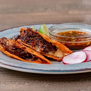 Braised Beef and Cheese Tacos with Tomatillo Salsa and Consomé. Limit 2 per transaction.