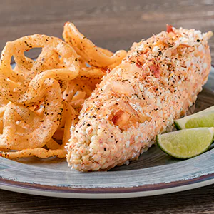 Corn on the Cob with Togarashi AÏoli, Queso Fresco, Furikake and Bonito Flakes, served with Wheat Chicharrones