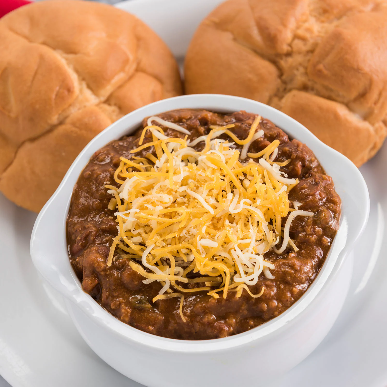 All-Beef Chili served with a Bread Roll, topped with Shredded Cheese