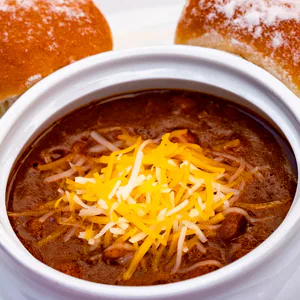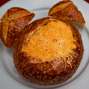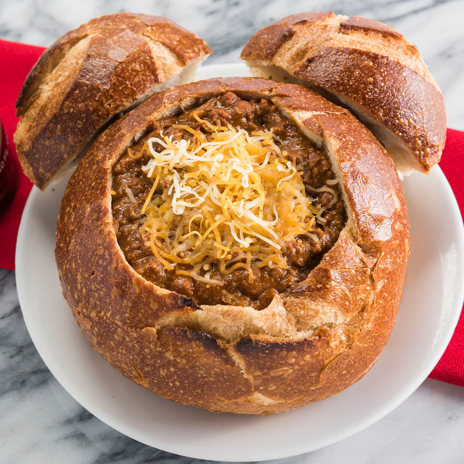 All-Beef Chili served in a Sourdough Bread Bowl topped with Shredded Cheese