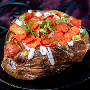 Baked Potato, All-Beef Hot Dog, Spicy Chili, Cheese Sauce, Sour Cream, Green Onion and Spicy Corn Chips