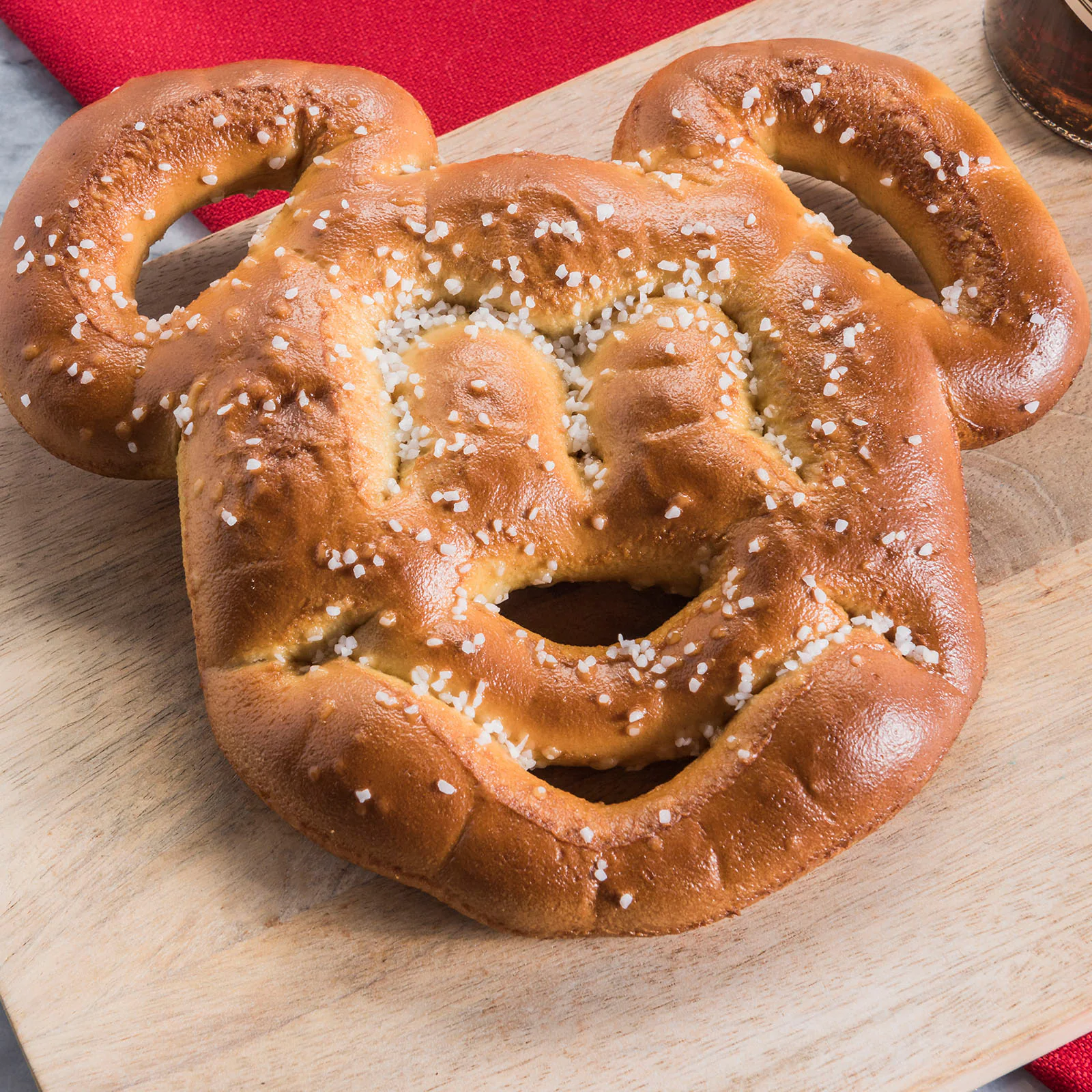 Warm Mickey-shaped Pretzel served dusted with Coarse Salt