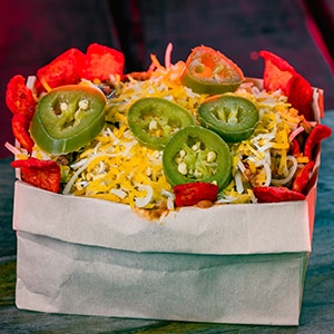Spicy Corn Chips topped with Chili, Cheese and Jalapenos