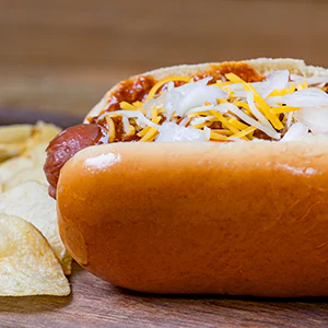 All-Beef Hot Dog topped with Home-style Chili, Shredded Cheese and Onion on an Allergy-Friendly Bun, served with a Cuties® Mandarin Orange or a Small Bag of Chips