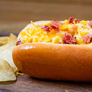 All-Beef Hot Dog topped with Macaroni and Cheese, Bacon Bits and served with a Cuties® Mandarin Orange or a Small Bag of Chips