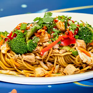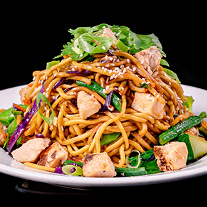 Grilled Chicken and Stir-fried Vegetables served over Noodles, tossed with Sesame-Ginger Sauce and garnished with Cilantro & Scallions