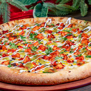 Spiced Red Sauce, Mozzarella Cheese, Roasted Corn and Al Pastor-marinated Chicken garnished with Crema & Tomatillo Sauce Drizzle and Cilantro
