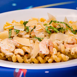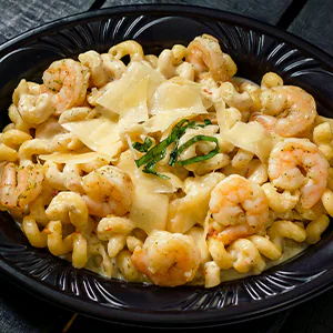 Fusilli Pasta topped with Garlic Shrimp, a Parmesan-Pesto Cream Sauce with Sun-dried Tomatoes and Shaved Parmesan Cheese