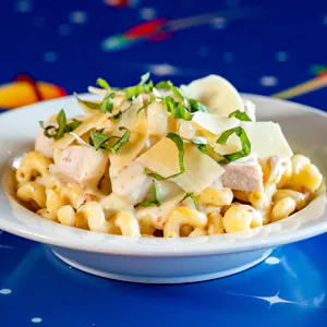 Fusilli Pasta topped with Seasoned Grilled Chicken, a Parmesan-Pesto Cream Sauce with Sun-dried Tomatoes and Shaved Parmesan Cheese