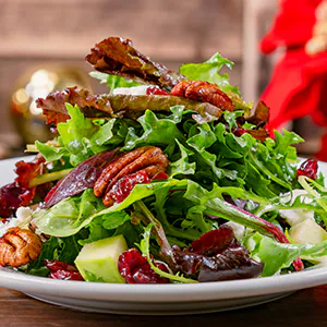 Mixed Greens with Frisée, Candied Pecans, Granny Smith Apple, Feta Crumbles and Maple Dressing