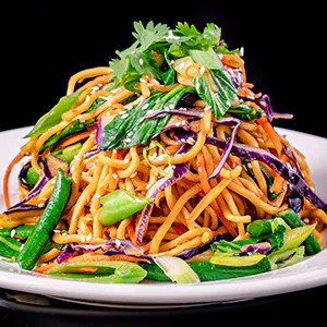 Stir-fried Vegetables served over Noodles, tossed with Sesame-Ginger Sauce and garnished with Cilantro & Scallions