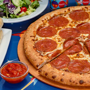 Whole 16-inch Pepperoni Pizza served Family-style with Two Breadsticks, Two Side Salads and Four Fountain Beverages