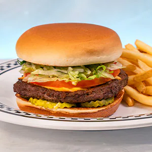 Beef Patty, American Cheese, Lettuce, Tomato and B & B Pickles on a Toasted Bun, with choice of Cuties® Mandarin Oranges or Fries