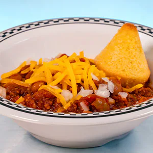 Hearty Chili, Cheddar Cheese, Diced Onions and Cone-shaped Cornbread