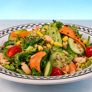 Romaine, Kale, Bean & Corn Salad, Cucumbers, Tomatoes, Crispy Quinoa, Toasted Sunflower Seeds and Zesty Dressing