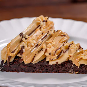 Brownie Slice topped with Peanut Butter Mousse, Melted Peanut Butter and Chocolate
