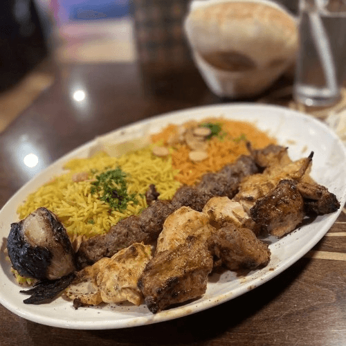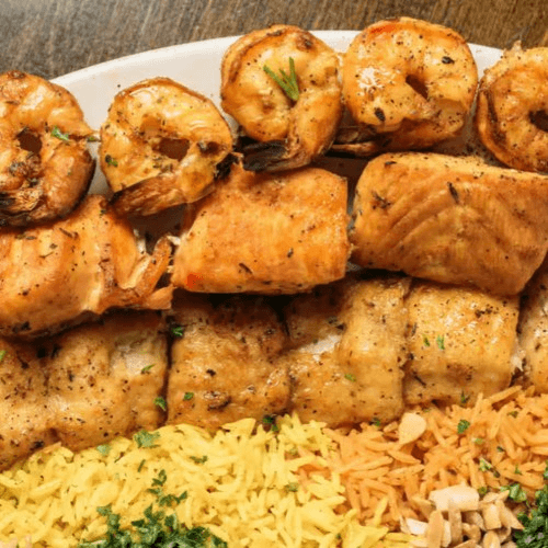 5 skewers of grilled salmon, 5 grilled shrimp, 5 basa fillet served on a bed of biryani and curcum rice, with humus, baba ghanouj, muthawama & fatoush salad. $5 charge for any item change