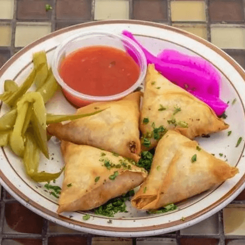 Fried pastry with savory filling, such as spicy potatoes, onions, peas, & lentils