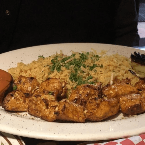 Two skewers of our special recipe of ground beef & lamb mixed with parsley, garlic, grilled onions & tomatoes served with two kinds of rice.