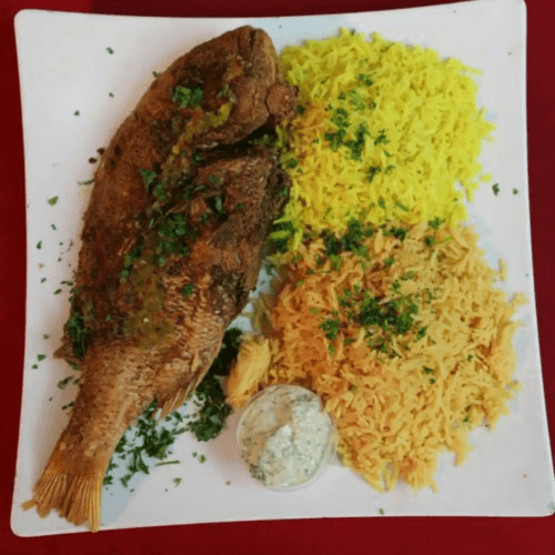 Authentic fish & rice flavored infused together with our rich spices. Served with our special fresh homemade tomato salsa. Topped with almonds, parsley & sauteed onions