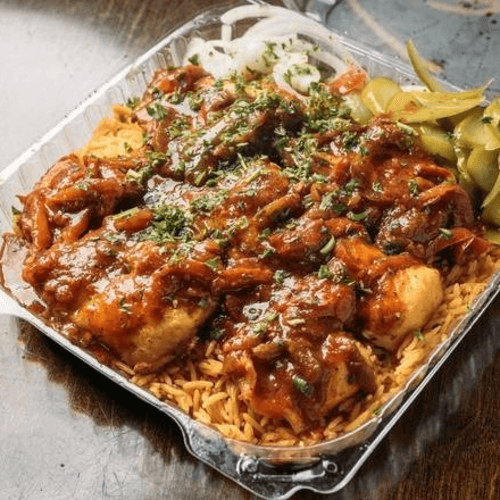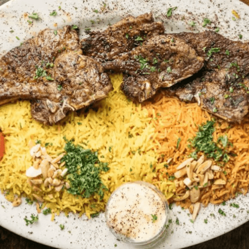 Qedra is a fragrant rice dish simmered with bone-in lamb shank or half chicken, infused with whole garlic cloves, garbanzo beans, and a warming blend of spices like turmeric, black pepper, cardamom, and cinnamon.