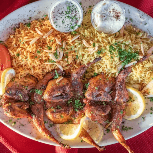 3 jumbo quails marinated in garlic, lemon, olive oil & special spices