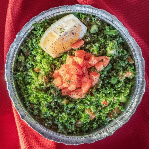 Finely chopped parsley, tomatoes, cucumber, lemon, fresh mint, onions, olive oil & tahini