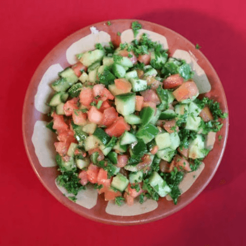 Finely chopped parsley, tomatoes, cucumber, lemon, fresh mint, onions & olive oil