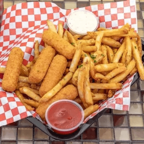 Falafel (4 pieces), grape leaves (2 pieces), feta cheese & a sampler of our famous humus & baba ghanouj