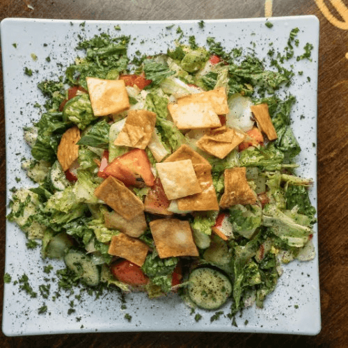 Mixed lettuce, tomatoes, cucumber, parsley, topped with baked pieces of bread