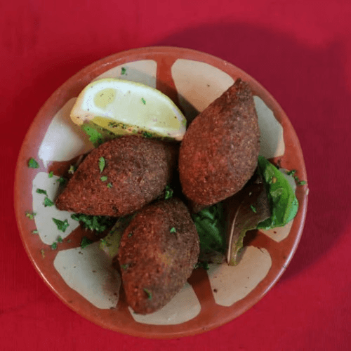 A shell of bulgur wheat & minced beef stuffed with ground beef, garlic, pine nuts & spices deeply fried