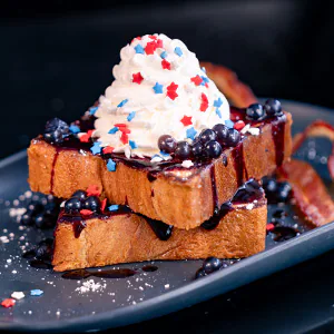 with Turkey Bacon, Blueberry-flavored Popping Spheres, Berry Jamaica Syrup, Whipped Cream and Sprinkles, served with a Cuties® Mandarin Orange and choice of small DASANI® Bottled Water or small Lowfat Milk