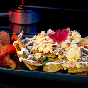 Tortilla Chips tossed in Tomatillo Salsa, Scrambled Eggs, Bacon, Queso Fresco, Pickled Onions and Crema