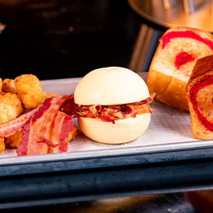 softly arranged Eggs and Turkey Bacon with Toast, served with a Cuties® Mandarin and choice of Small Lowfat Milk or Small DASANI® Water. Meets Disney Nutrition Guidelines for Complete Meals without substitutions